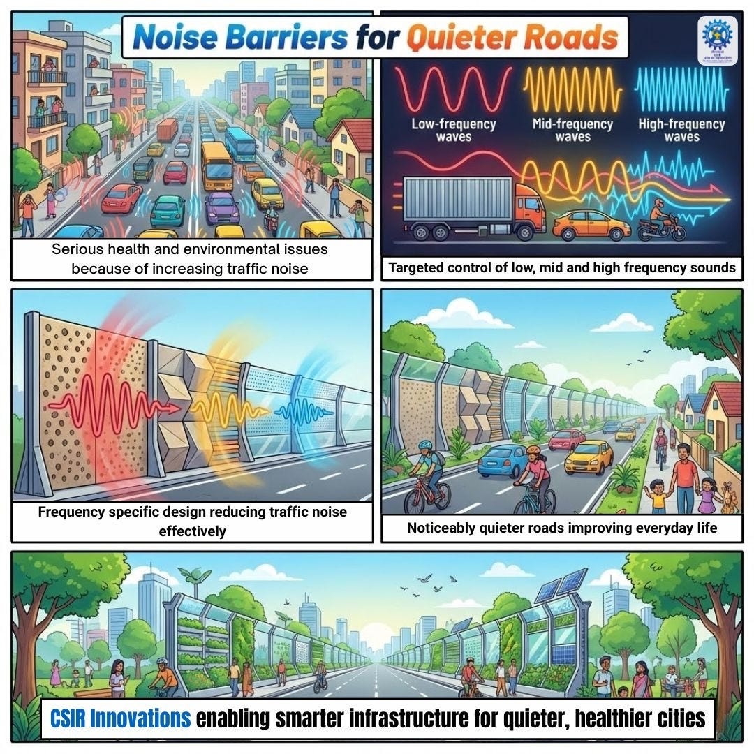 CSIR‑CRRI’s smart noise‑barrier research moved from lab curiosity to urban health tool, as field results showed that engineered barriers along flyovers can cut noise enough to save up to ₹5.5 crore per 1,000 people per km annually in avoided health costs. This is lab‑to‑land at its finest: a single stretch of barrier turns down stress hormones, heart‑disease risk, and lost productivity for tens of thousands of city residents at once.